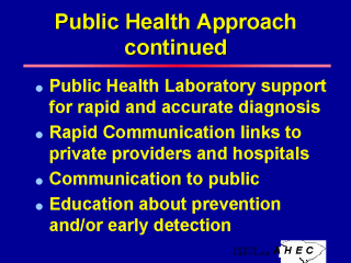 Laboratory support is required for rapid and accurate diagnosis of an outbreak or unusual disease. Sometimes a definitive diagnosis may not be possible immediately. Clinical signs and symptoms of the illness may be the only information available from which to develop a differential diagnosis. Rapid communication links must be established with private medical providers and hospitals to alert them to outbreaks and disease changes as well as to facilitate collaboration, communication, and coordination. Communication with media is essential to inform the public and provide accurate information for action and prevention. Aggressive education of health care providers and the community about prevention or early identification and detection. Information should include a list of signs and symptoms, and guidelines for prophylactic treatment, protective clothing, or other personal protection. For example, during/following a hurricane, information about food spoilage and unclean water is widely disseminated along with tips on what to do with food in freezers that were without power - all in an effort to prevent secondary food and water-borne diseases in the midst of a disaster. Similarly, tetanus vaccinations are provided in flood areas where risk of a dirty injury is greater. |