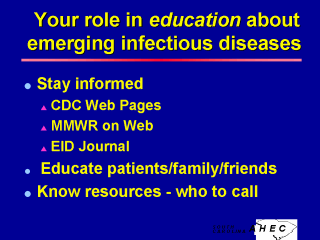 Stay informed. The Centers for Disease Control and Prevention is a source of scientific information on emerging infectious diseases available over the Internet. “Surf” the CDC Website to look at Prevention Guidelines available on virtually any disease; go to MMWR and see the most current information or visit the Public Health Training Network site to find educational offerings through on-site and distance learning. Subscribe via e-mail to Mortality and Morbidity Weekly Review from the CDC at listserv.cdc.gov or to Emerging Infectious Disease Journal. The latter is a peer-reviewed journal to enhance communication of public health information among professionals working in infectious disease and related sciences. Educate yourself. Become an informed professional in infectious diseases. Evaluate the effectiveness of infection control measures in your setting. Know the surveillance procedures and the Infection Control “coordinator” in your facility. Use safe and cost effective measures to protect yourself and your customers. Educate your clients, family, and friends. Distribute CDC Prevention guidelines. Be creative in incorporating information about prevention of infectious diseases into your personal and professional life. Offer presentations in elementary and secondary education settings in your area. Learn the resources within your practice setting, the location of your local health department and how to contact them. |