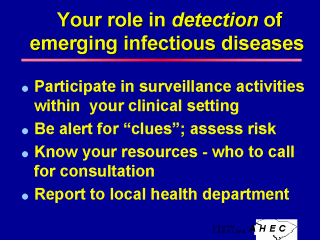 - Post a current list of reportable diseases and know the procedure for internal surveillance in your setting. - Know the infection control protocols and procedures and assess whether they address the threat of emerging infectious diseases. - Assess risk and be alert for clues of infectious diseases in your personal and professional life. - Identify resources for current and accurate information and