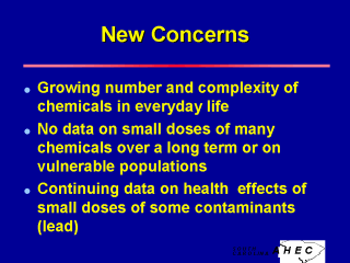 Little is known about the health effects of the growing numbers of natural and synthetic chemicals in the environment. Questions of dose, chemical interactions, brief versus long exposure times, and other factors complicate understanding and predicting health effects. Since case control studies of populations is unethical, the only available means of determining effects on human health are: - Laboratory animal experiments. - Data from worker studies. - Studying persons exposed through unintended releases and disasters. The effects of lead poisoning are better understood than most other chemicals, but not all chemicals have been analyzed for health effects. Few have been analyzed for long-term exposure at small doses. The impact of small dose exposures over long periods of time are not understood as yet. Resource: The Pew Environmental Health Commission at the Johns Hopkins School of Public Health. See report, “Healthy from the Start: Why America Needs a Better System to Track and Understand Birth Defects and the Environment.” |