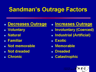 Sandman notes that the reaction to things that scare people and the things that kill people are often inversely proportional to the actual hazard. He has identified 20 “outrage factors.” Exercise: Ask participants to think of examples of outrage factors: e.g., Voluntary: sky diving Natural: earth quake Familiar: radon in basement Memorable:Aljar apples (media) Dreaded: cancer, Chronic: fatalities and injuries scattered and See publications on risk communication for detailed explanation. Examples: Improving dialog with communities: A Short guide for government risk communication by Caron Chess, Billie Jo Hance and Peter M. Sandman, 1988. Available from Rutgers Center for Environmental Communication. |