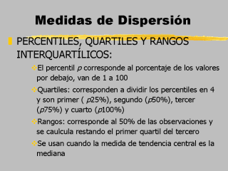 - Quartiles: corresponden a dividir los percentiles en 4 y son primer (