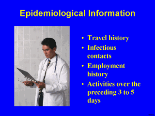 and their families to obtain useful epidemiological information. Questions asked should focus on the patient’s recent history of travel, infectious contacts, employment, and activities over the preceding 3 to 5 days. Corporations, particularly those engaged in international business travel, should be especially vigilant for unusual illnesses among their travelling employees. |
