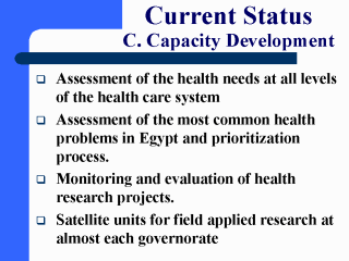 Programs adopted at personnel capacity level: - 2 Year course in field epidemiology for field practice to identify problems and carry out a research project. - Annual 2 week course on health system research with intervening periods for homework