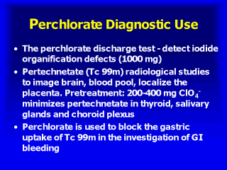 | tracer radioiodine ± 500 µg stable iodide. 3 hr thyroid radioiodine uptake, followed by 1 gm of ClO4, radioiodine uptake 1 hr later. Decrease in the thyroid iodine uptake @ 4 hrs > 15% of the 3 hr uptake is a positive test indicating an iodide organification defect |