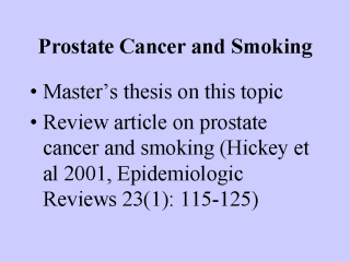 | I wrote a review article in Epidemiologic Reviews on smoking and prostate cancer with my academic supervisors Professor Kim-Anh Do (from the MD Anderson Cancer Center Texas) and Professor Adele Green (Queensland Institute Medical Research). That issue of Epidemiologic Reviews (23/1) is devoted solely to prostate cancer and is useful further reading. |