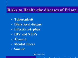 fit and healthy. In fact these young men have often neglected their health or have had little or no understanding of health and hygiene. Upon entry they will often have: Untreated dental disease Skin infections Venereal disease They may have addiction problems with alcohol or drugs, they are heavy smokers and drinkers. Their physique may be poor from an inadequate diet and no attempt at physical training. They may have untreated mental illness-depression, anxiety. There is a high risk of suicide, particularly among the remand prisoners. |