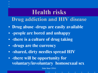have replaced tobacco as the currency. It is suggested that some connivance by the Prison Authority occurs as prisoners stupefied by drugs are more malleable, less violent, less likely to break out. There are particular problems with injectable drugs where needles are shared communally, are in short supply and rarely disinfected. The Prison Authority finds it difficult to admit that drugs are circulating freely for it is an adverse comment upon Prison security and discipline. It is therefore difficult to provide cleansing materials-like bleach, a needle exchange scheme or even free condoms where the authorities deny that drugs are injected or sodomy occurs. |