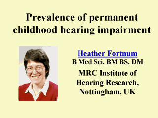 | Heather Fortnum qualified originally in Medicine but has worked as a research epidemiologist for the UK Medical Research Council since 1989. Her research interests focus on permanent hearing impairment in children, its prevalence and aetiology and on the provision of services within both health and education. |