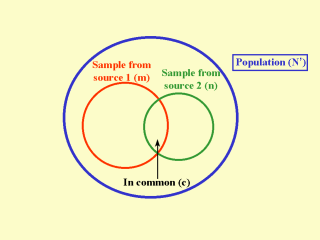 a diagrammatic representation of capture-recapture methodology. N ’ = size of populationN = estimate of size of population m = number in sample 1 n = number in sample 2 c = number in common p1 = probability of inclusion in sample 1 = m/N ’p2 = probability of inclusion in sample2 = n/N ’p12 = probability of inclusion in both samples = c/N ’ |