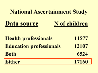 | We conducted a National ascertainment study in the UK. Professionals in the UK health service and professionals in the UK special education service provided information for a total of 17,160 individual children: 11,577 from health sources, 12,107 from education sources and 6,524 from both. |