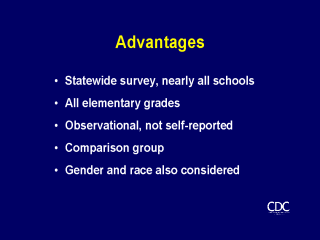 limitations are more than offset by these advantages: Our study is a statewide survey that included nearly all public school in Florida, and all elementary grades K-5 were included. This is an observational and not self-reported data collection, with comparison groups, counties with the law vs. counties without the law. Two important variables were measured: Gender and race. |