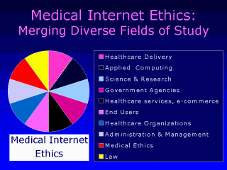 Internet ethics is a multidisciplinary field involving many diverse areas of study: - Healthcare Delivery - Applied Computing - Science and Research - Government Agencies - Healthcare services, e-commerce - End users - patients, healthcare consumers - Healthcare Organizations - HMO’s, Insurance Co. - Administration and Management - Medical Ethics - Law |