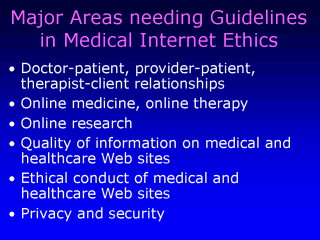 identified in this paper needing guidelines are: - Determining the nature of the doctor-patient, provider-patent, or therapist-client relationships. - Defining what constitutes online medicine, online therapy and online research. - Establishing what is Researching and what is “Lurking” in online settings. - Establishing ethical guidelines for soliciting research participants, online. - Respecting the right to privacy vs. collecting research information on site visitors. |