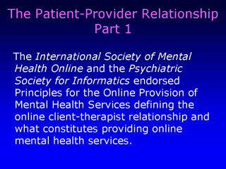 | The Internet is changing the patient-provider relationship, whether physician-patient, or client-therapist, and the paradigm under which medicine and therapy has been practiced for centuries; one based on the presumption that in order to treat, the physician or provider must see the patient to diagnose. |