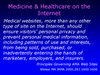 | Without enforceable guidelines for creating healthcare sites, ensuring privacy and standards for conducting online researcher, Internet users risk their private life unexpectedly becoming public potentially facing repercussions if insurance companies, employers, friends or family discover confidential information about them. |