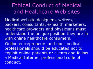 | All those involved in the creation, maintenance and marketing of healthcare websites should be required to adhere to a strict code of medical Internet ethics. |