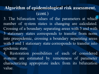 | So, the risk is estimated on a degree of system parameter approximation to their bifurcation values, which characterize system transition from one its steady state (norm), to another (epidemic or preepidemic). |