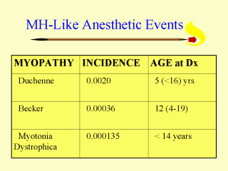 and could mimic MH. The muscular dystrophies are a group of diseases characterized by progressive but variable rate of loss of muscle function. Duchenne’s muscular dystrophy is the most severe form. It is a inherited as a recessive trait that is expressed in boys (x-linked). The abnormality is due to lack of production of dystrophin. Dystrophin deficiency weakens the muscle cell membrane increasing susceptibility to cell membrane damage. Serum creatine kinase levels reflect the progression of skeletal muscle degeneration (17). Becker’s dystrophy’s clinical presentation resembles that of Duchene’s dystrophy. However, its onset is delayed and the progression of the disease is slower. Patients with Becker’s dystrophy have abnormal dystrophin or reduced levels of normal dystrophin (17). Myotonia dystrophica is the most common form of a group of diseases known as the myotonias. The basic clinical feature is delayed relaxation of the skeletal muscle after voluntary contraction. It is an autosomal dominant inherited disorder (17). As mentioned earlier, patients with these diseases may not develop signs of skeletal muscle weakness until adolescence. Exposure to some anesthetics, however, may “unmask” the disease. Succinylcholine is contraindicated in patients with dystrophinopathy because massive rhabdomyolysis, hyperkalemia, and cardiac arrest can occur. Also, prolonged exposure to inhalation anesthetics, without exposure to succinylcholine, may be followed by severe rhabdomyolysis. To confirm the diagnosis of any form of dystrophinopathy, muscle, even post-mortem muscle can be assayed for dystrophin. Or any genetic material can be examined for the characteristic defect on the X chromosome. |