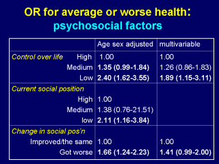 determinant, almost doubling the odds of average or worse health. Social position was also important, but this could be explained by control as I’ll show in a minute and was not therefore included in the final model. Change in social position – used as a marker of change was significant in the first model, and borderline in final model. |