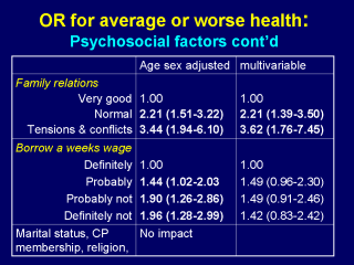 it has a buffering effect. The ability to borrow money was significant in the age sex adjusted and intermediate model but not in the final model. This is not surprising as ability to borrow money will depend on a series of factors – both networks (that we were using it for) but also wealth and social status, so having controlled for these factors it was no longer significant. Marital status, Communist Party membership and membership of a religion were not important. Overall therefore, informal networks were protective but formal networks were not which fits with Roses work on social capital in the FSU. |