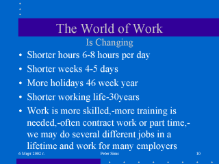 army of clerks, ticket collectors, factory operatives………. Many of the dull, repetitious tasks no longer need human beings. The family firm extending over generations is unusual, a firm may be floated, developed, produce and close down in as little as ten years.The guarantee of a lifetime employment within the womb of a single company is no longer feasible. The demand increasingly is for skilled work where quite long training may be required.Skills become redundant in a fast moving hi-tech world and a period of further training may be necessary. Workers and work is much more mobile-call centres in India serving Western Europe. With a mobile telephone and a lap tap/hand held computer it is possible to work and be in touch almost anywhere in the world.. |