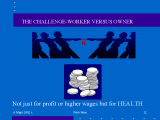 employer and the worker, the owner and the trade union. This model is inappropriate for the new world of work. Union power is most effective in the large factory or by exerting huge pressures on national governments by essentially closing down essential services-docks, railways, power, communications…………….... Management is most powerful in the Japanese car industry where the employee becomes a company man, with a company house, a company car,and takes his rest and recreation in the company’s sports grounds, swimming baths and entertainment complex.He trades freedom for security and a cocoon of protection……………... In the former Occupational Health was a right to be fought for alongside better working conditions, shorter hours and more pay. In the latter it was another perquisite (perk) for the job and might include annual executive health checks and free private medical care for employee and dependents. In today’s world there is a mixed economy-large firms, multinationals, nationalised industries,small private employers,still a few migrant workers and more self employed..it has to be co-operation and not conflict for work and for health. |
