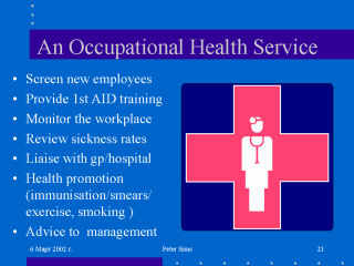 Health Service is seen increasingly as an essential service for any large employer. Smaller employers may join a consortium and use a service provided to perhaps 6 or 10 firms on the base of the number of employees and the nature of the service required. If an Occupational Health Service makes even small (!-2%) reduction in sickness absence rates……..and it will usually be far more effective, then it will comfortably meet its costs when the number of workers is 1,000 or more. The Occupational Health Service will also be welcomed by the workers who will take its presence as an indicator of management’s concern-there will be less sickness, better morale and in the event of accident or injury proper records, urgent treatment on site, rapid transfer to secondary care, proper sick leave, compensation and retraining as appropriate. If matters have to be resolved in court the company will be able to indicate an effective track record of care and service. |