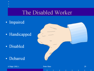 occupations e.g.The epileptic from bus driving. Disability is the slant placed upon handicapping conditions by society and extends to the world of work. Often it is assumed that people with severe handicaps cannot work nor would wish to do so. In fact if the work place can be adapted to their needs then they often want to work, are conscientious, proud of their skills, productive and glad to be part of the “world of work” rather than the “world of dependency”. Their presence in the workplace is an important influence on the other workers and helps their integration into society. There may be a quota system trying to ensure that a firm or company employs a minimum percentage of disabled workers and has an environment adapted to their special needs. This may not work for many disabled people are reluctant to be registered as such because of the associated stigma. There may be special workshops for disabled men and women-classically for the blind or sometimes sheltered workshops where their employment is subsidised despite low productivity for the beneficial effects upon their self pride and physical and mental health.. |