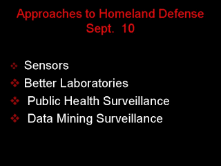 4 primary components of the public health system in Sept. 10. 1.Sensors: These are the development of anthrax and other disease"sniffers", using chip technology. The concept is to have these widely distributed to identify Anthrax at its first sign. There are two problems, the first is that many of the chips will not be available for years to come, so all we have now are "vaporware" sensors. The second is that for the chips to be effective, then need to be distributed to millions of places. The problem is that there is not sufficient bandwidth to accomplish this. 2.Better Laboratories: This appears to be at first thought, a good idea. However, reducing bioterrorism with better laboratories is like trying to reduce the number of homicides with better autopsies. 3.Public Health Surveillance: There has been a major push to improve the surveillance in the US. Clearly better surveillance is important. However, how much can be gained? There actually was little problem in the identification of the Anthrax cases. Better surveillance may gain perhaps 1-2 days in identification, probably not sufficient to prevent many cases. 4.Data Mining Surveillance: This is designed to evaluate different sources of data, such as Kleenex sales from grocery stores, or absentees in children. There is an enormous problem of signal to noise, e.g. kids get sick for many reasons. Once again the gain in terms of days is small. If we hold all of these up to the litmus test of the terrorist attacks to date, it is difficult to see how any of the existing terrorist attacks could have been prevented. |