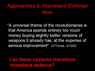| As with other weapon's systems, there is always the battle between low risk-low gain approaches, and high-risk high-gain approaches. We have to evaluate the transforming capabilities of our approach and the degree to which risk is reduced, and safety improved. Once again, it must be recognized that the Sept. 10th approaches did not work. |