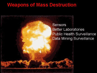 | Often bioterrorism is called a "weapon of mass destruction". Another weapon is an nuclear bomb. If a nuclear bomb were exploded in Washington, would sensors, laboratories, or surveillance have any effect? Probably not, as the effect of the weapon of mass destruction would be obvious. In the same way, if there was a massive bioterrorism attack, it would be noticed quickly. |