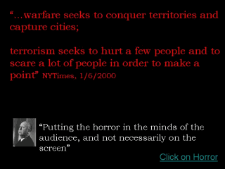 | Often we talk about terrorism, with our really defining it. Terrorism is not warfare, the goals are different. Terrorist want to seed a political message into our minds, murder, and violence are secondary. Hitchcock is a perfect spokesperson for terrorism. |