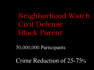 | In the past 30 years various forms of civil defense has evolved, including neighborwatches, CD, and block parents. All we want to do is to move the concept onto the Internet. It has been estimated that there are 50 million participants. It has been estimated that there is 25-75% reduction crime, potentially we could achieve the same risk reduction for terrorism. Is there any other approach that with this magnitude of risk-reduction. |