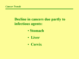 Consider these trends in the world’s tumor burden. Currently, the developing world is undergoing a decline in three cancers due partly to infectious agents as these agents have been controlled -- cancers of the stomach, liver, and cervix. |