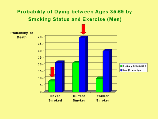 For men the findings are even more striking. Men who smoke and do not exercise are more than four times as likely to die as those who exercise regularly and do not smoke. Indeed, they have almost a 1 in 2 chance of death in mid-life during their most productive years. |