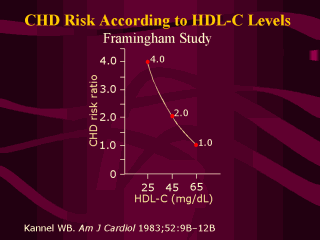 Data from the Framingham study1 suggest that the risk of coronary heart disease (CHD) varies continuously with high-density lipoprotein cholesterol (HDL-C) levels. The CHD risk decreases by half for each 20-mg/dL increase in HDL-C.