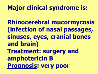 | Pulmonary infection can also occur, with very high mortality rate.Diagnosis is made by direct smear and by isolation of molds from respiratory secretions or biopsy specimens. |