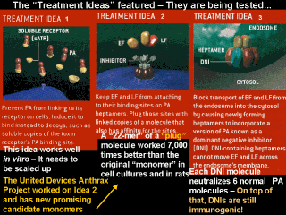 decoys, such as soluble copies of the toxin receptor's PA binding site. TREATMENT IDEA 2: Keep EF and LF from attaching to their binding sites on PA heptamers. Plug those sites with linked copies of a molecule that also has affinity for the sites. TREATMENT IDEA 3: Block transport of EF and LF from the endosome into the cytosol by causing newly forming heptamers to incorporate a version of PA known as a dominant negative inhibitor (DNI). DNI-containing heptamers cannot move EF and LF accross the endosome's membrane. |