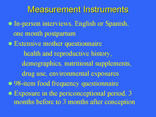 Questionnaire - The interview instrument was modeled after the Centers for Disease Control and Prevention’s 1993 mother questionnaire for birth defects risk factor surveillance Food Frequency Questionnaire - The Food frequency questionnaire was developed by TDH for this study population - Questions were based on 100 24-hour dietary recalls among new enrollees in the federal Women, Infants, and Children (WIC) nutrition program in Cameron, El Paso, Hidalgo, and Webb counties - The enrollees in WIC, poor Mexican American women of childbearing age, typified the high risk border population |