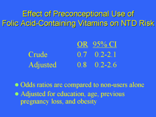 risk due to folic acid - This estimate had a confidence interval which overlapped with the null; this is compatible with no effect |