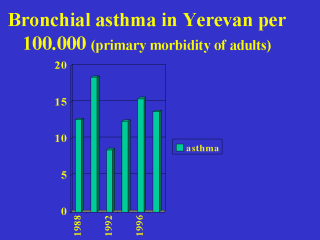 formaldehyde and benzene were found in the air of Yerevan. Because of changes in the type of heating system in Armenia the level of indoor air pollution has increased. At the same time breathing pathologies, contributing to a rise in death rate, lung’s cancer , still births, infant mortality and bronchial asthma have increased. The sickness rate and the death-rate of breathing pathologies have also diminished. The most expressive the above mentioned changes have been manifested in Yerevan. |