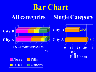 | The bar chart is exactly the column chart but the bars are horizontal rather than vertical. Still they are constructed to show the frequency or relative frequency (percentage) for each category. Usually the bars are equal in width. It is important that the horizontal scale starts at zero otherwise the lengths of the bars are not proportional to the frequencies. |