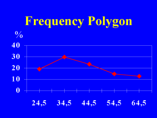 | The frequency polygon is constructed by joining the midpoints of the top of each bar. It provides easy visual appreciation for one or more distributions drawn on the same chart. |