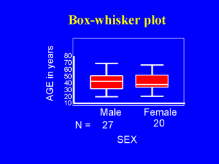 | The box-whisker plot can be used to compare the values of a continuous variable across the categories of a discrete variable. It shows the median, the first and third quartiles, as well as, the minimum and maximum values across the categories of the discrete variable. |