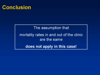 | We have now shown that the assumption of similar mortality rates in and out of the study is incorrect, at least for the Jamaican SS disease population. We therefore have to try something else, as these early deaths will impact on our survival figures. |