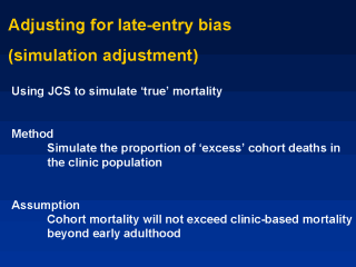 | Alternatively, we can incorporate the excess cohort-mortality into the clinic-based population to create a new (simulated) analysis dataset for which the assumption of comprehensive mortality information is appropriate. No statistical adjustment for late-entry bias is therefore necessary. It is assumed that JCS mortality will not exceed clinic-based mortality beyond age 25 (the age of the oldest cohort members in 1999). |