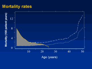 patient population in each year from birth to 25 years (total simulated deaths=684), and