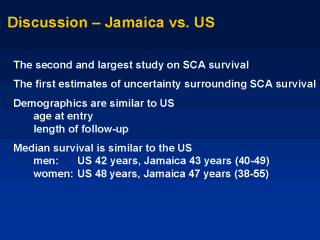 disease population. The current study offers precision for survival estimates in SS disease. It highlights the inherent uncertainty of statistical estimates, and is an important reminder that survival summaries should be presented as intervals for which one has a measure of confidence. We know that important demographic information is similar in the Jamaican and US prospective clinic populations (age at entry to study, length of follow-up). And using the same statistical adjustment to cope with late-entry bias, survival summaries are similar. |