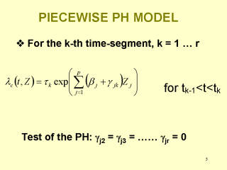 Following the approach proposed by Thierry Moreau in the framework of the Cox model ,we have developed a piecewise PH relative survival model, in which the disease-related hazard is expressed as a step function of the follow-up time. The effect of the j-th covariate is represented by b j + g jk. As a consequence for a given covariate b j the PH hypothesis can be tested by LRT with r-1 degrees of freedom. As the parameters g jk are independent, using more than 2 time-segments allows estimating non-monotonic variations of the hazard ratio. |